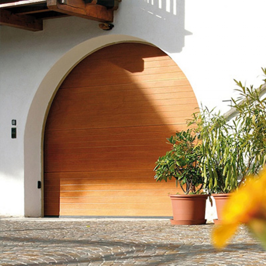 PEGASO je garážová brána tvorená farbenou hliníkovou konštrukciou s výplňou z masívneho dreva okoumé vo všetkých dostupných dizajnoch - Polis, Civic, Top alebo Gara.