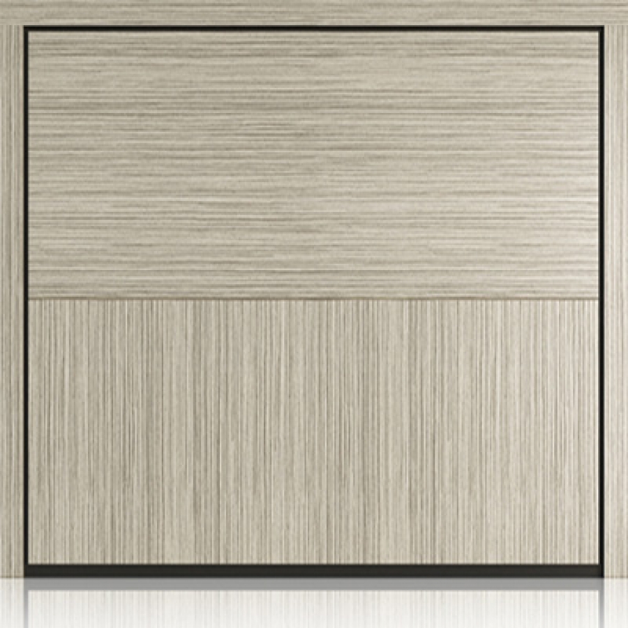 Dizajn garážovej brány v prevedení TWO pracuje s vnútornou štruktúrou samotného dreva. Kombinuje vertikálnu a horizontálnu kresbu dreva a vytvára tak prirodzený vzhľad vyzdvihujúci krásu materiálu. Je zložená z panelov hrubých 75 mm, ktorých povrchové obloženie tvorí ušľachtilé drevo. Môže byť vyhotovená v šiestich druhoch dreva - afrického oukumé, severskej jedle, dubu, smrekovca a teaku. Každé z nich je morené v 6-tich odtieňoch. Okrem tohto prírodného prevedenia je možné drevo leštiť a povrchovo upraviť v širokej palete štandardných farieb.